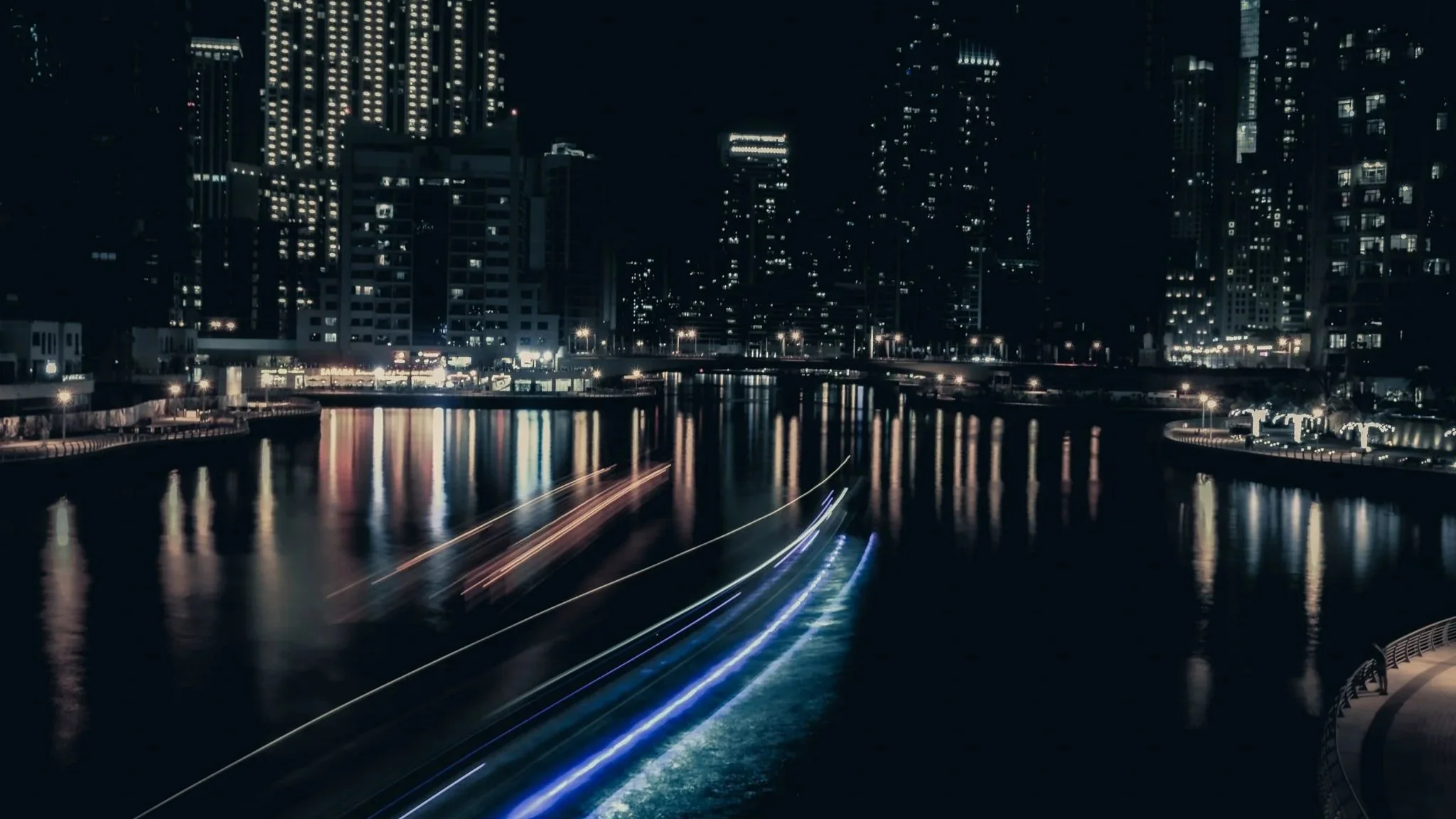 The Dubai Marina at night. In the bottom right, a lone figure stands still as shapes rush past. It’s hard to stay the same when everything else is moving so fast.