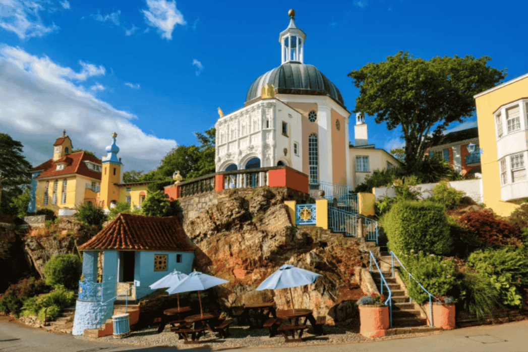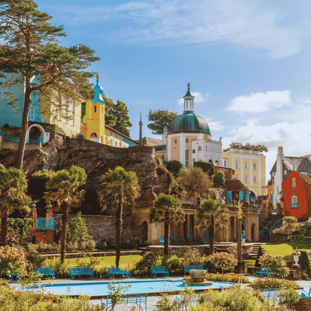 Portmeirion feels like it has been lifted from the Amalfi Coast and spiritually dropped into the Welsh woodlands and dark green hills. It is an Italian-inspired village, built in the Italianate style, where buildings resemble classical Mediterranean architecture. And so we have a Mediterranean vision in pinks, teals, and terracotta; a nest of domes and towers amid the distinctly Welsh countryside of mountains, seas, coves, and vistas.